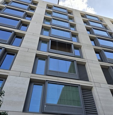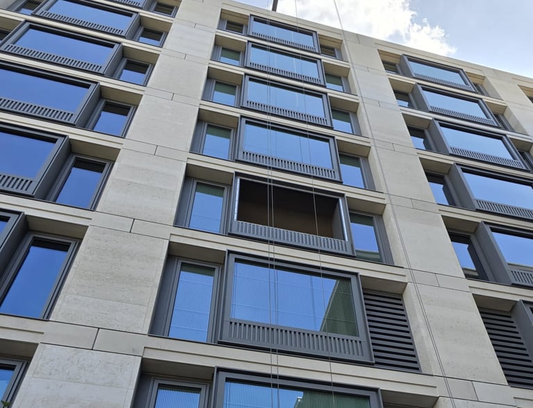 Charter Facades supplied this project with all disciplines and skills from our installation operatives, supervisors, project management, quality assurance management as well as the supply of all plant and specialist equipment to complete the installation of this external façade. In addition to the external façade elements our scope also included, fire stop specialist, abseilers, setting out engineers, supply of protection, cladding of roof plantrooms, installation of terrace curtain walling on levels 8 and 9, raised planters and terrace seating. At ground floor level we installed the retail front curtain walls, arcade timber slatted cladding, soffits and all doors.